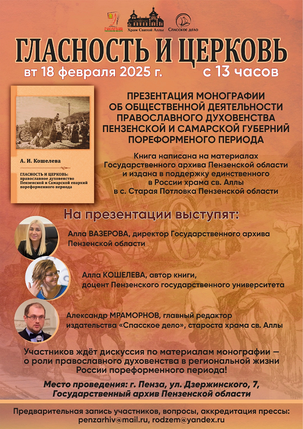 18 февраля в 13.00 в Государственном архиве Пензенской области (г. Пенза, ул. Дзержинского, 7) состоится презентация книги «Гласность и Церковь: приходское духовенство Пензенской и Самарской епархий в пореформенный период».